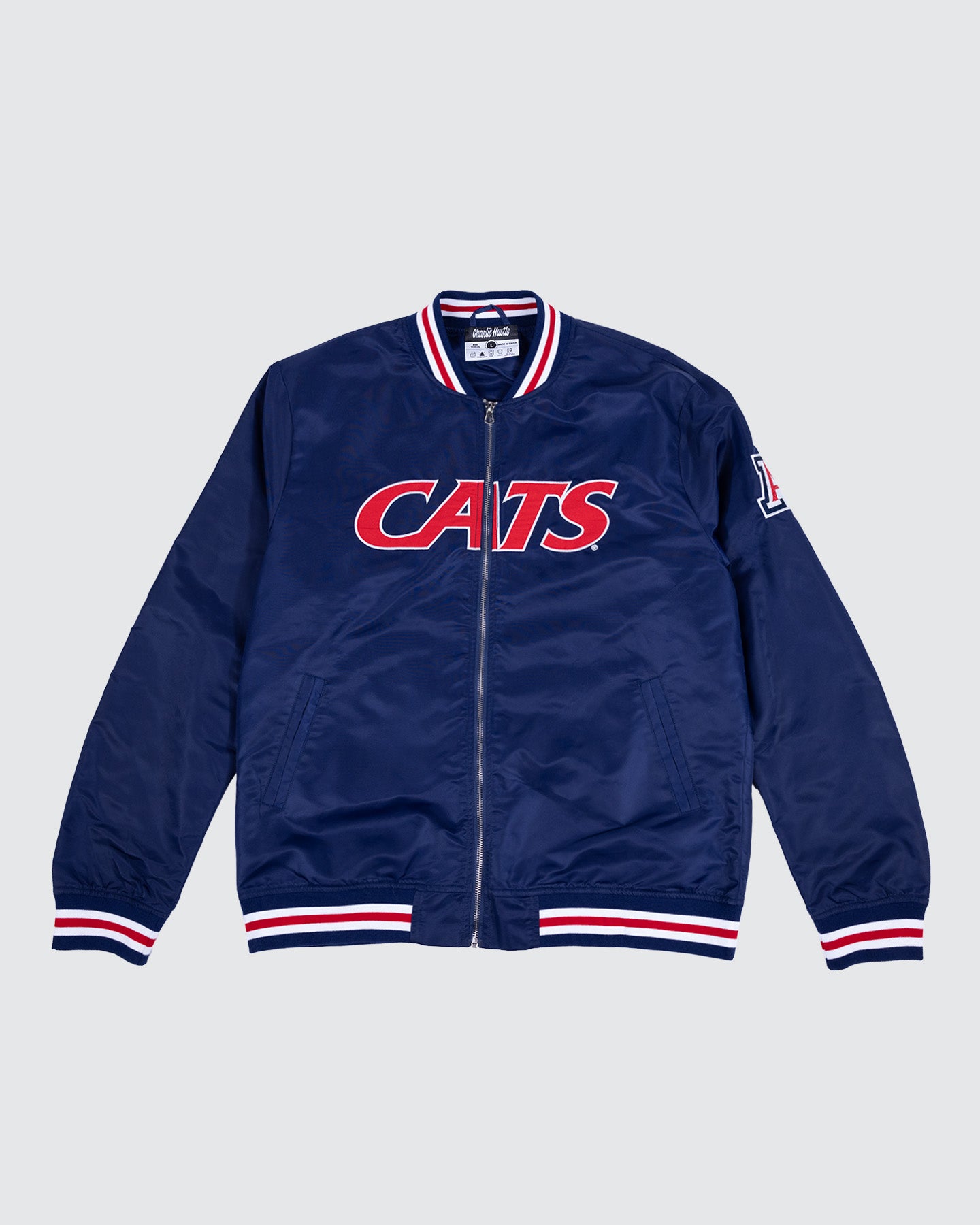 Show your Wildcat pride in style with this classic Arizona varsity jacket! Featuring bold “CATS” lettering across the chest, iconic “A” logos on each sleeve, and red, white, and blue striped trim, this timeless piece brings school pride and vintage flair together. Perfect for game days, campus hangs, or showing your Wildcat spirit anywhere you go.