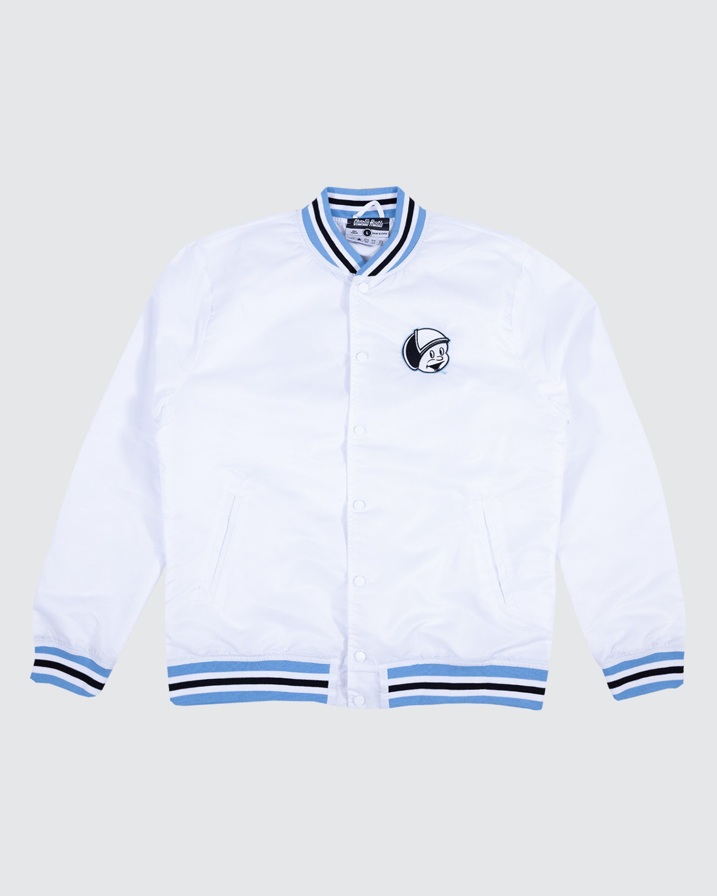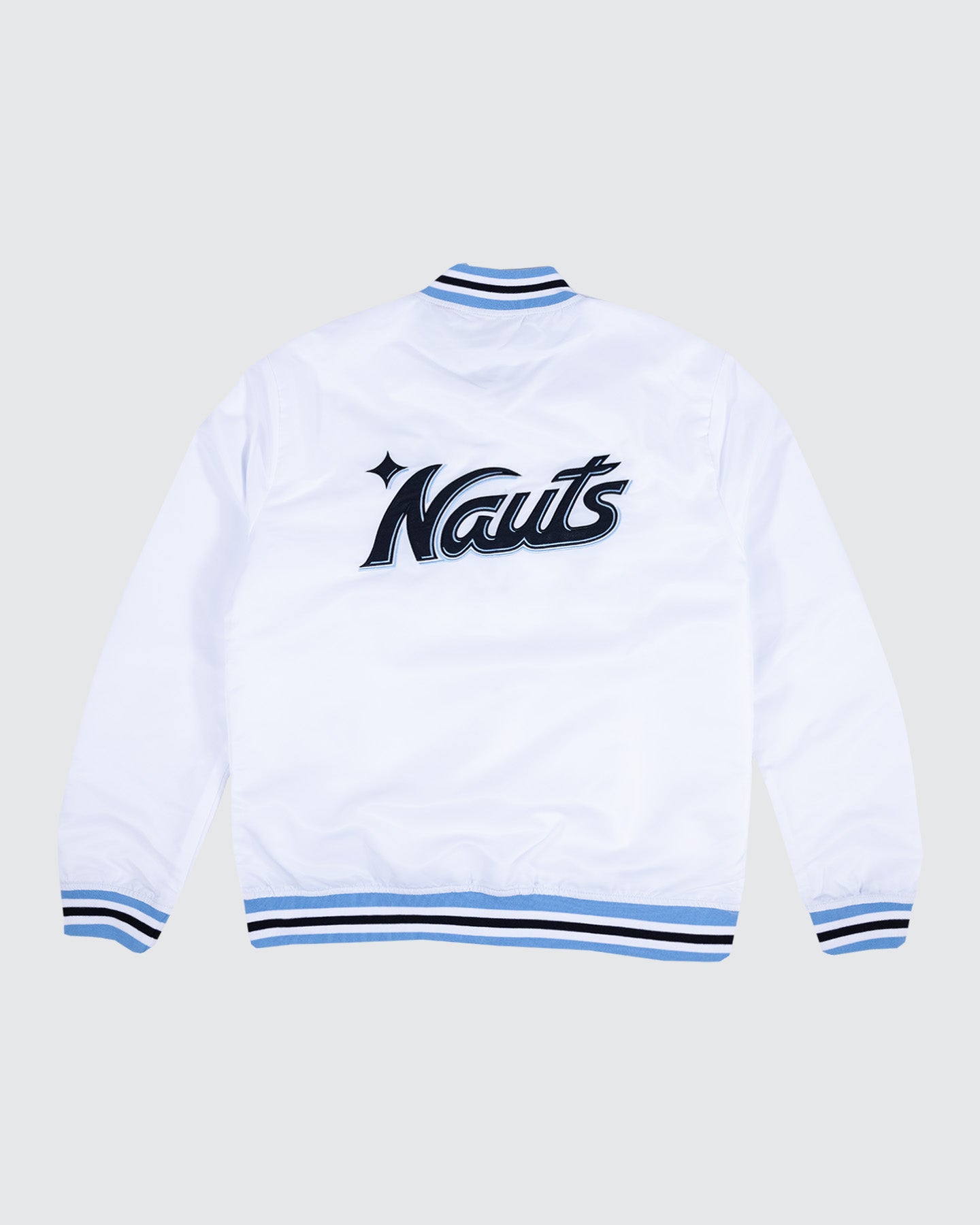 Blast off in vintage UCF pride with the Citronaut College Vault White Letterman Jacket. This retro-inspired varsity jacket features the iconic Citronaut mascot on the front chest and bold “Nauts” script across the back — a throwback to UCF’s original space-age spirit. With crisp white fabric, sky-blue and black striped detailing, and classic button-up styling, this jacket perfectly captures the fusion of nostalgia and modern fan energy. Whether you’re cheering from campus or out on the town, this piece celebrates UCF history in true throwback fashion.
