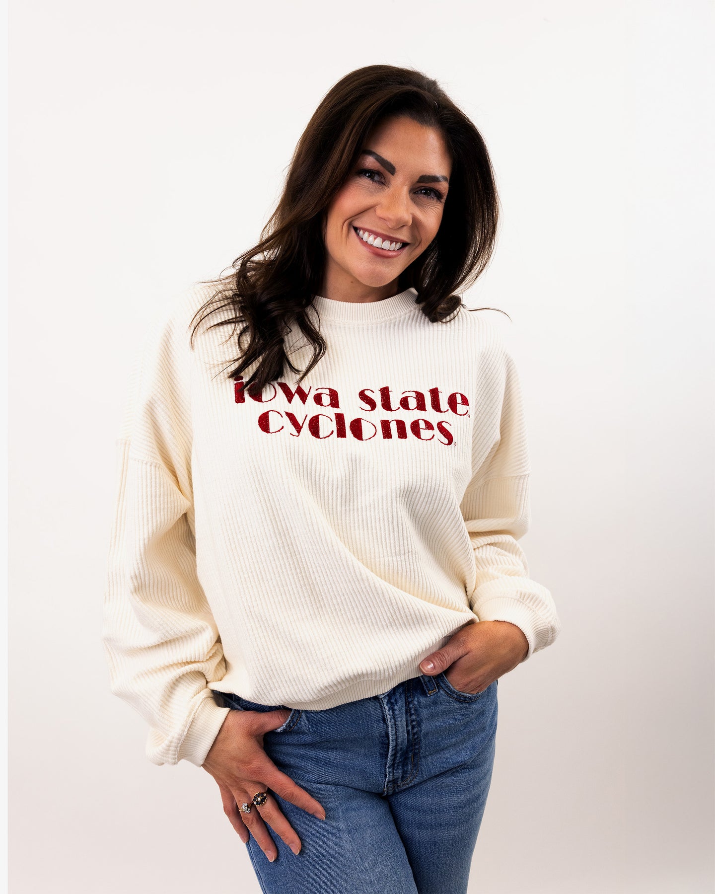 Elevate your everyday look with the Women’s Iowa State Corded Crew. This crew combines comfort with a timeless, vintage-inspired vibe. The subtle pink embroidered “Iowa State Cyclones” embroidery adds a refined touch that pairs effortlessly with jeans, leggings, or joggers. Perfect for layering on Game Day, this crew is a versatile staple for any local fan.