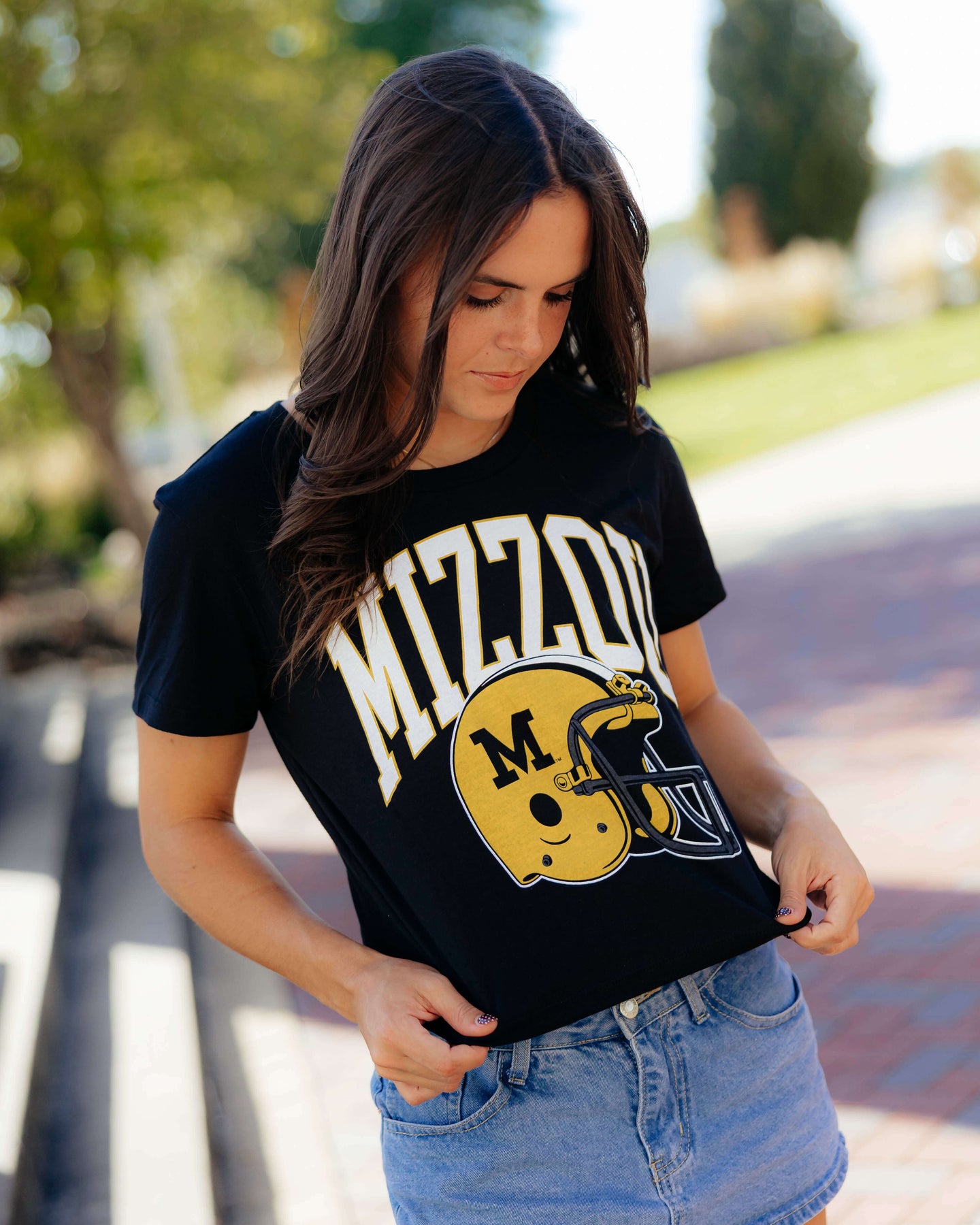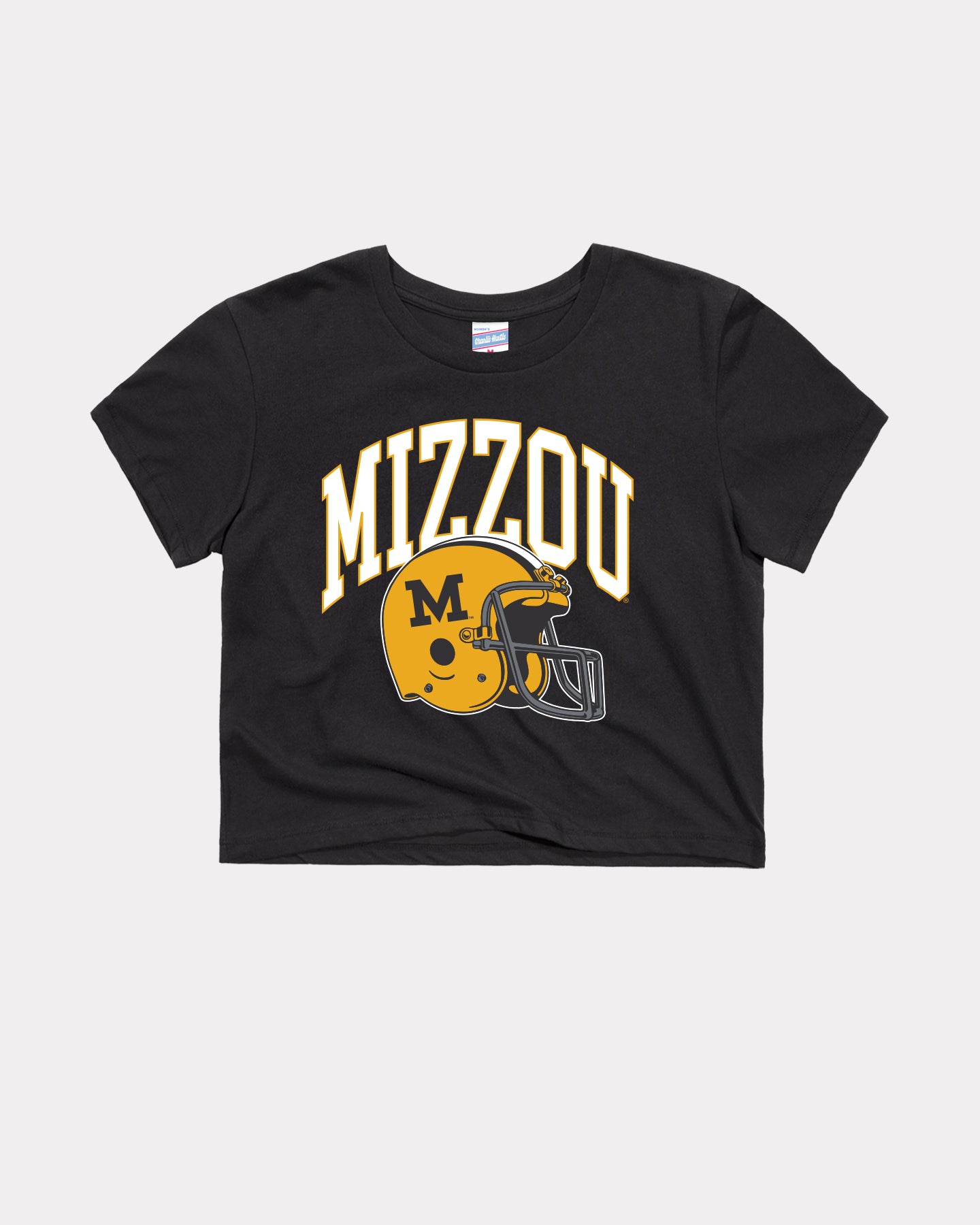 Rep your Tigers pride with the Women’s Mizzou Arch Helmet Black Crop Top. Featuring bold “MIZZOU” arch lettering and the classic Missouri Tigers football helmet graphic, this top brings vintage-inspired game day style to your wardrobe. The golden yellow and black school colors pop against the deep black fabric, making it the perfect statement piece for any University of Missouri fan.