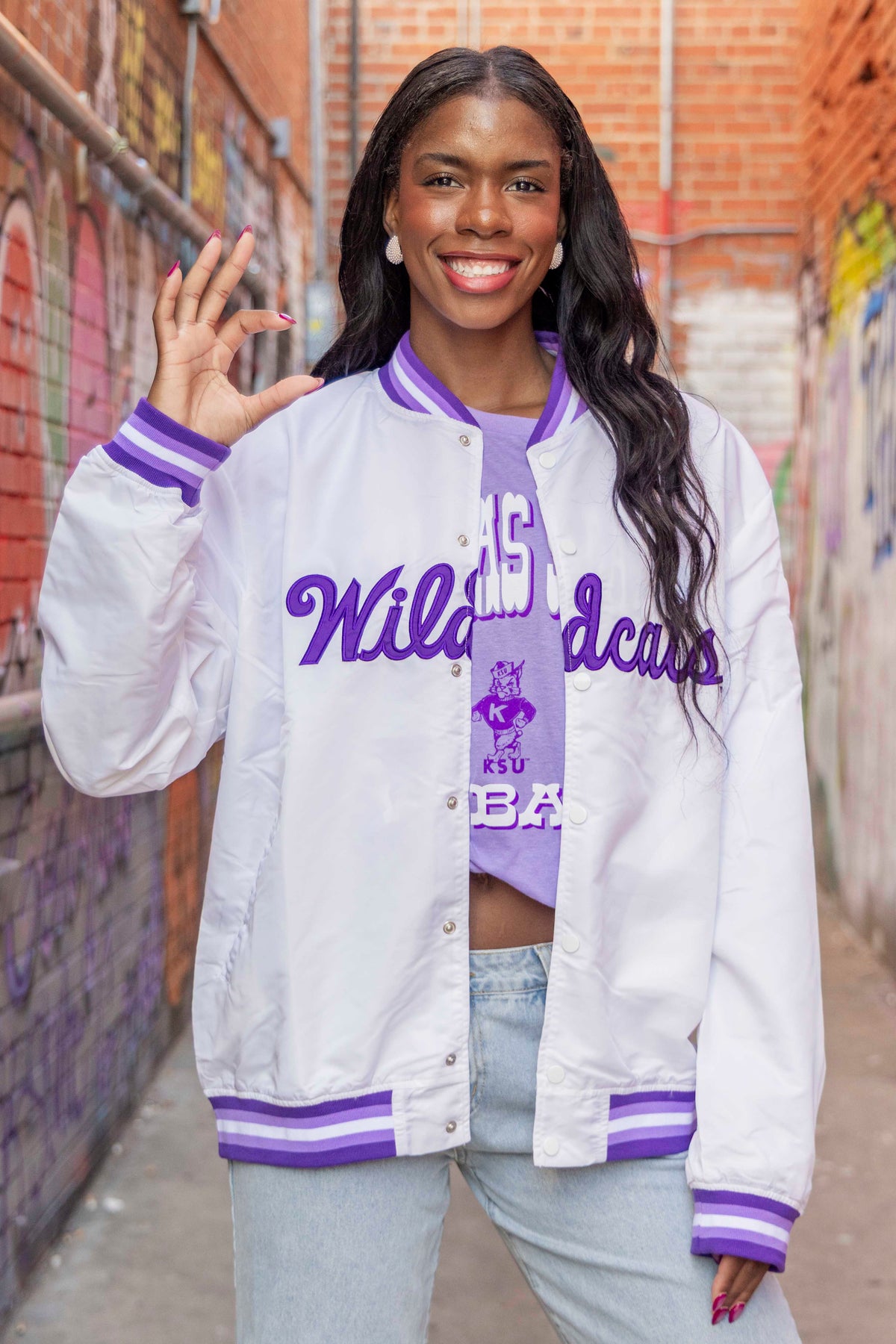 Wildcats fans are going to go crazy for this vintage-inspired Wildcats Script Letterman Jacket. This classic K-State Jacket is sure to turn heads wherever you go and is perfect for gameday in Manhattan and beyond! Available in six sizes.