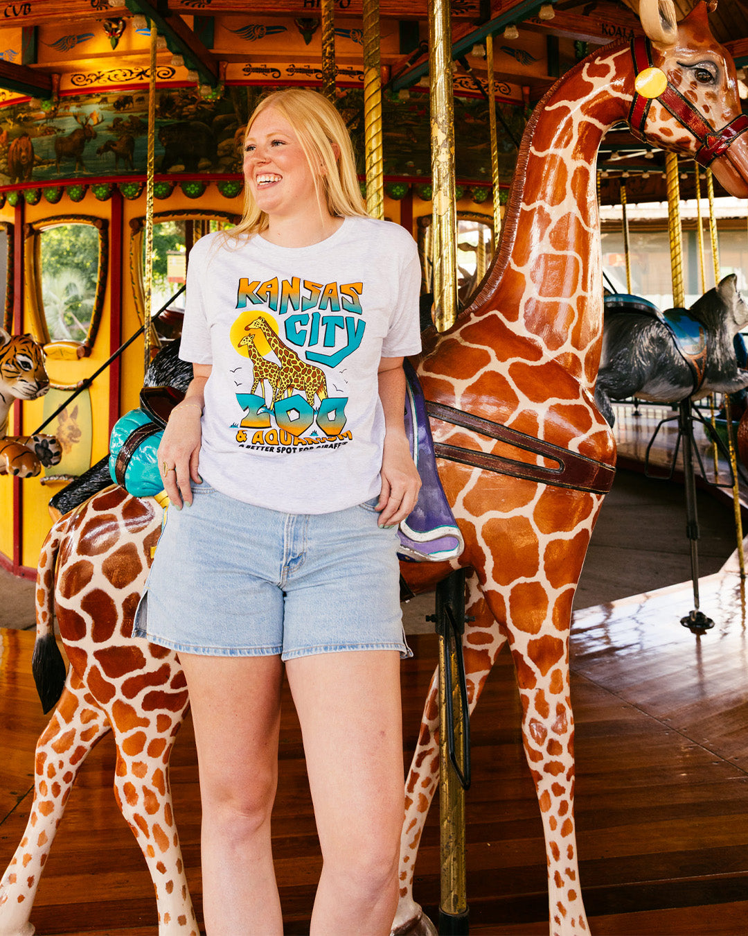 Tall style, even taller purpose! This Kansas City Zoo & Aquarium T-Shirt celebrates the zoo's all-new giraffe exhibit – an expansive savanna-inspired space giving these gentle giants room to roam. With bold, safari-style lettering and a sunset-kissed duo of giraffes, it's the perfect fit for animal lovers and KC adventurers alike. A portion of proceeds from every shirt sold supports the Kansas City Zoo & Aquarium, helping care for the animals and expand conservation efforts right here in the heartland!