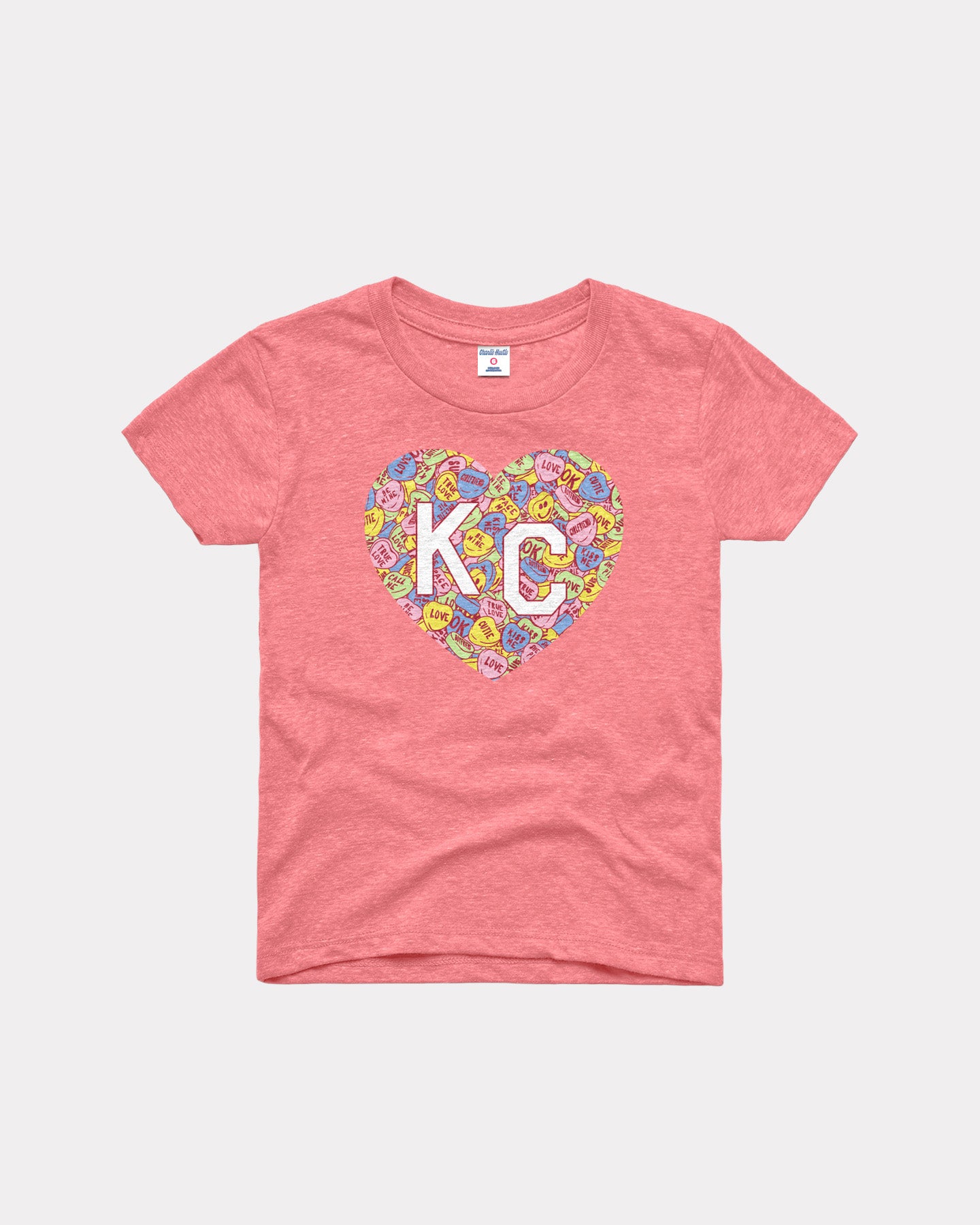 Our sweetest tee is here! The KC Candy Heart Youth Tee is perfect for a classroom Valentine’s Day party or snacking on something sweet! This iconic KC pride tee features a bold heart graphic filled with playful candy-inspired phrases and finished with crisp KC lettering at the center.