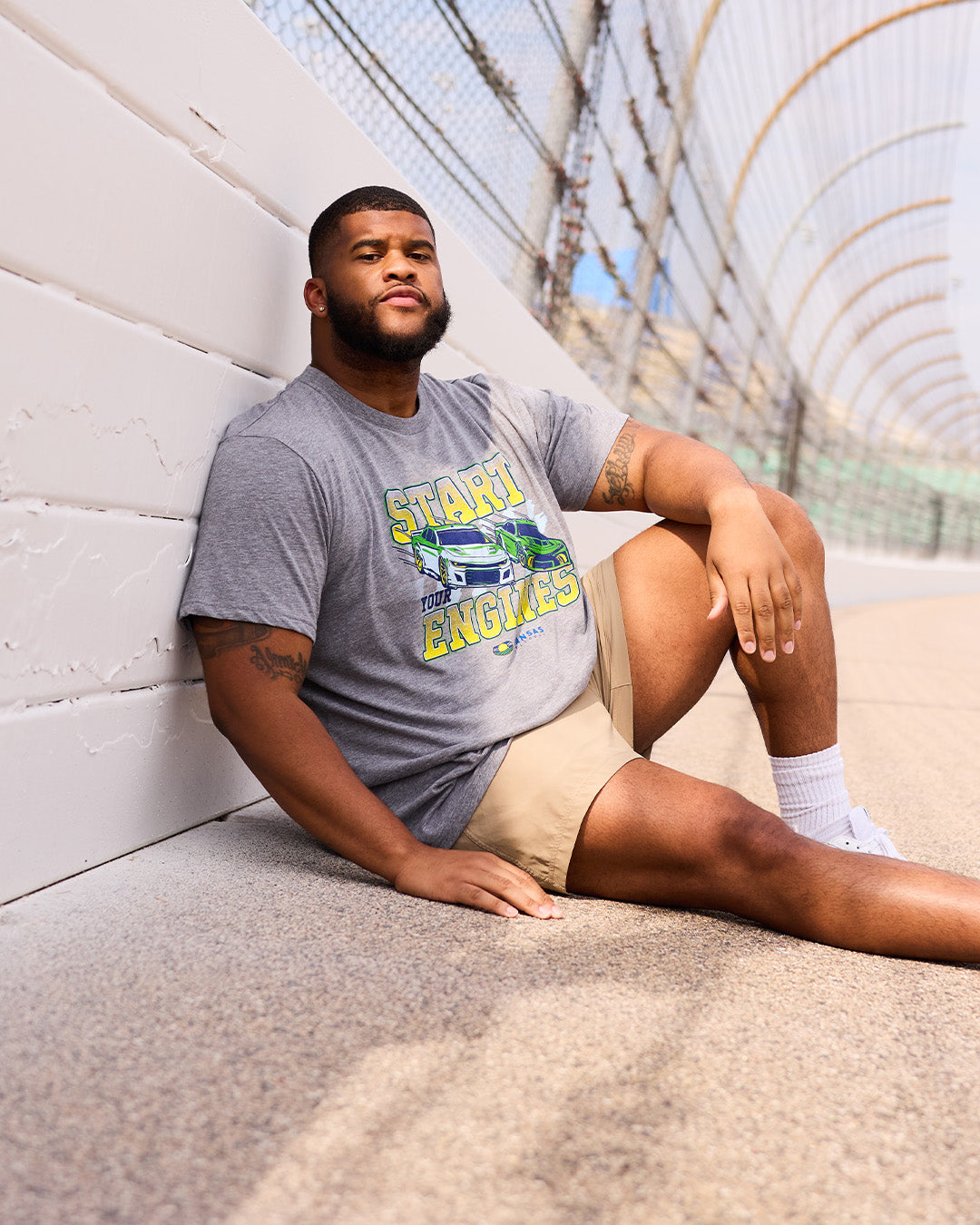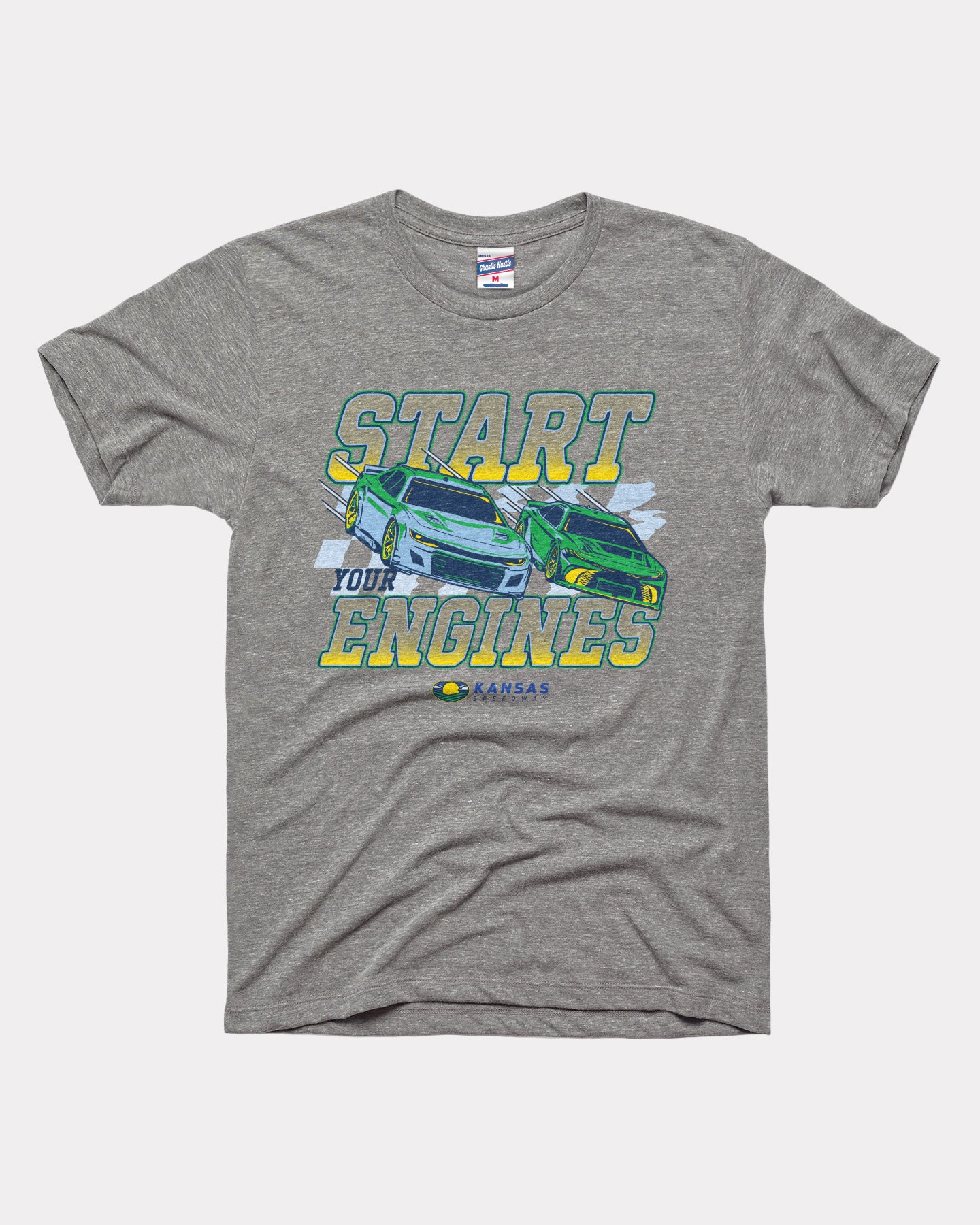 Get ready for race day with this bold “Start Your Engines” tee featuring two high-speed cars and the Kansas Speedway logo. Printed on a soft white shirt with vibrant green, yellow, and blue accents, it captures the thrill of the track from the first lap to the checkered flag. Perfect for fans who want to bring Speedway energy to every outing.
