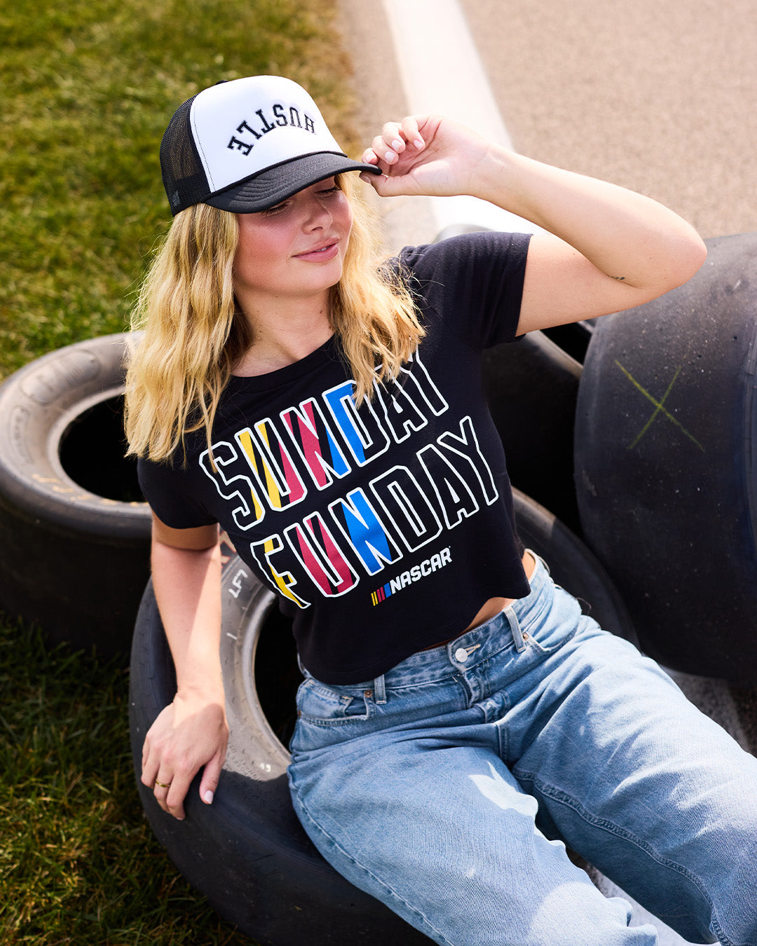 Make every race day a Sunday Funday with this bold NASCAR crop top. Featuring eye-catching block lettering filled with NASCAR’s signature colors on a sleek black crop silhouette, it’s the perfect mix of sporty and stylish. Soft, lightweight fabric makes it a go-to for the track, tailgates, or casual weekends.