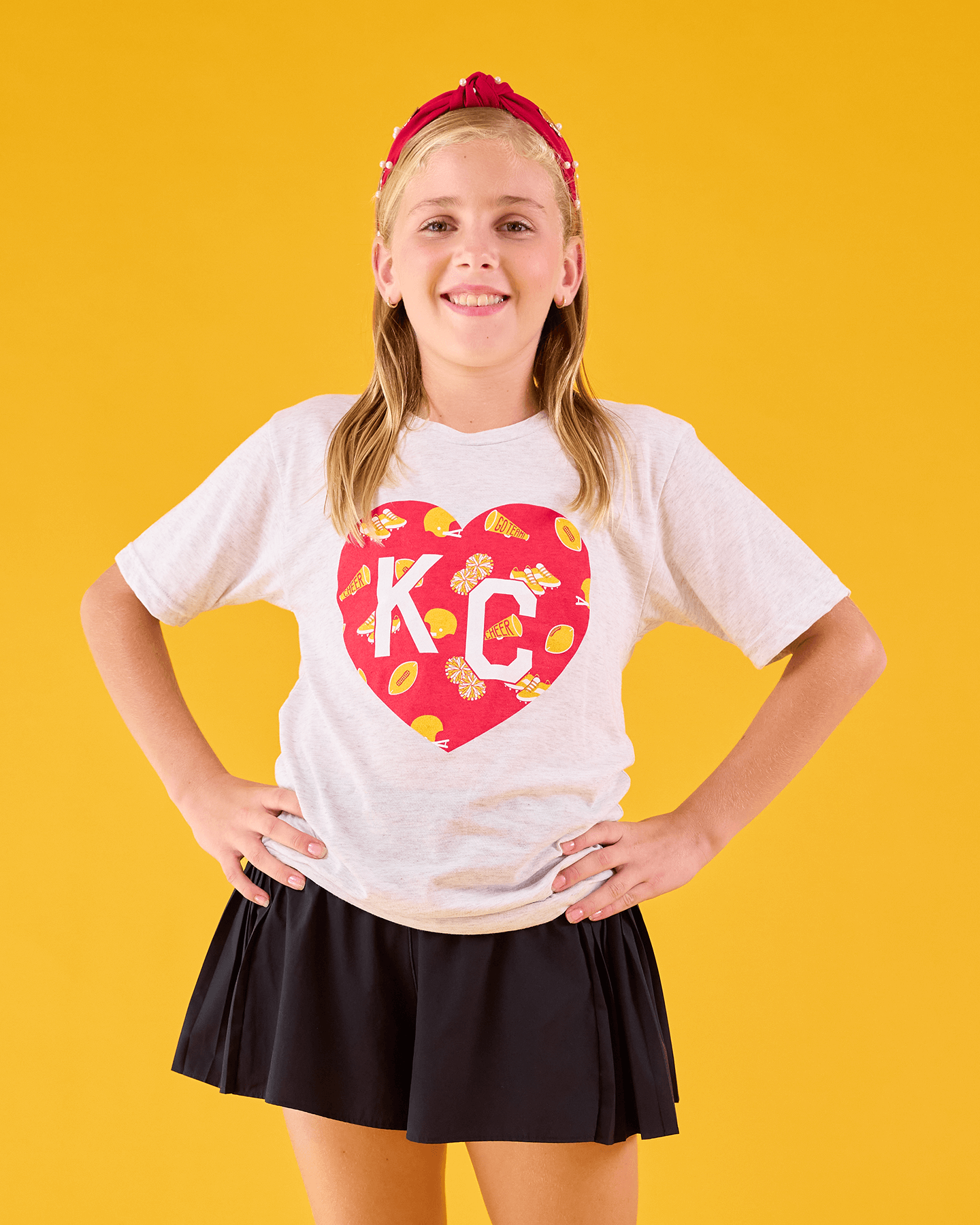 Let your little fan show their KC pride with this fun and football-filled KC Heart youth t-shirt! Covered in all the game day favorites—footballs, helmets, cleats, and pom-poms—this tee is perfect for cheering on Kansas City's favorite football team. Whether it’s a school spirit day, tailgate party, or just backyard football with friends, this shirt brings the KC energy. Big style for the smallest fans!