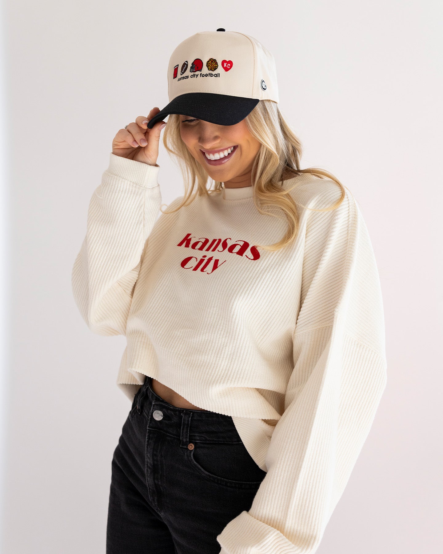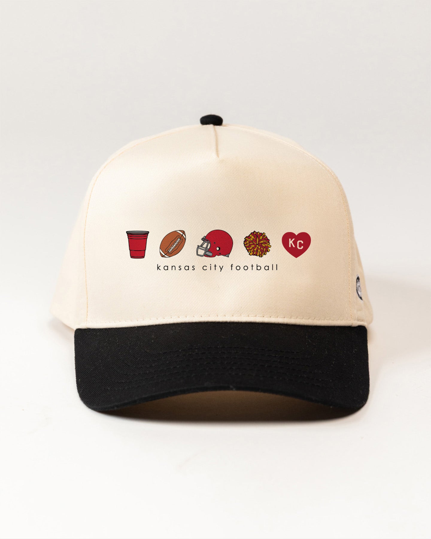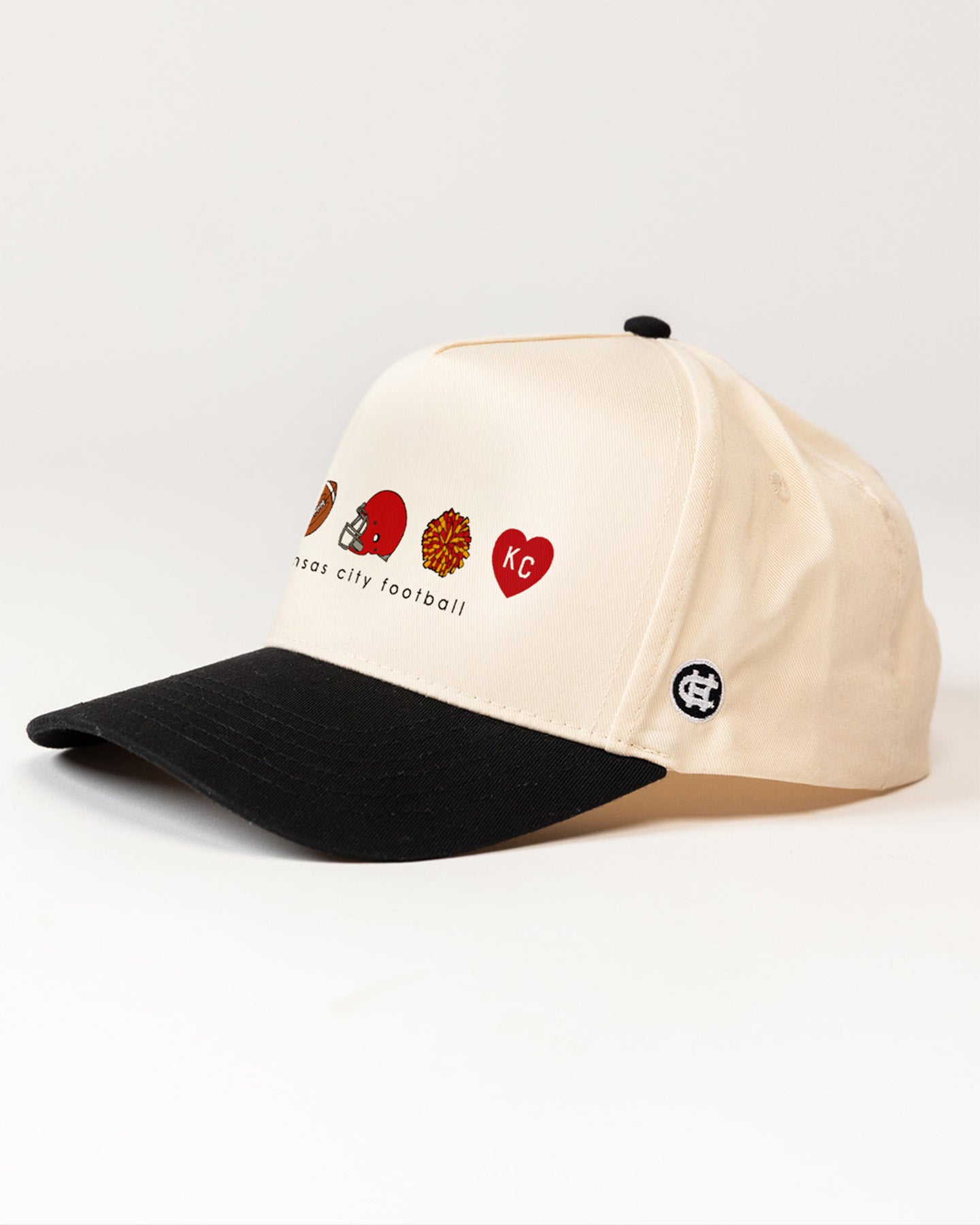 Top off your game day look with the Kansas City Football Tan & Black Two-Tone Hat. Featuring embroidered football-inspired icons — from the helmet and pom to the KC Heart — this cap is a bold nod to hometown pride. The black bill and tan crown create a versatile look that pairs with any outfit, while the structured fit keeps it comfortable from kickoff to the final whistle.