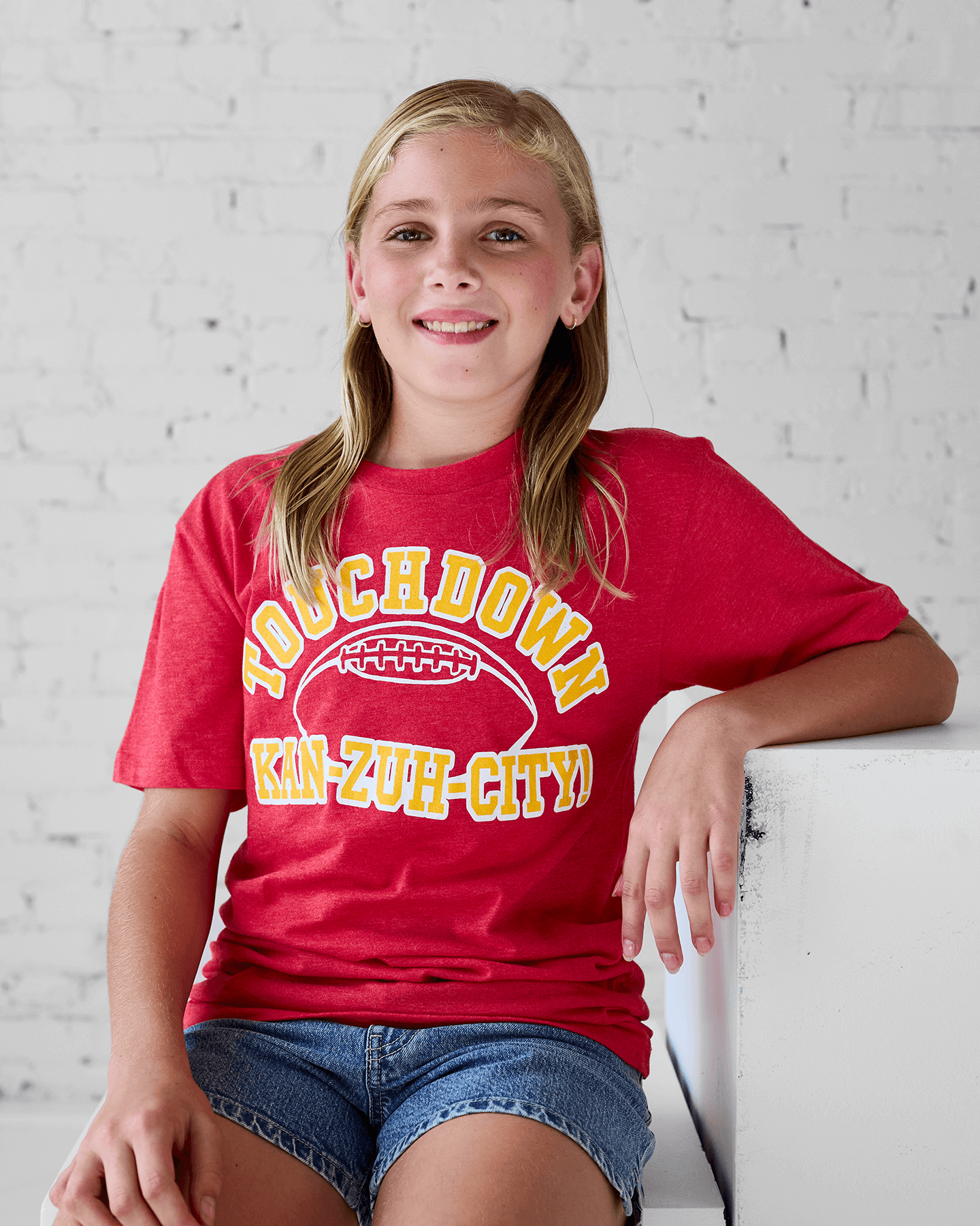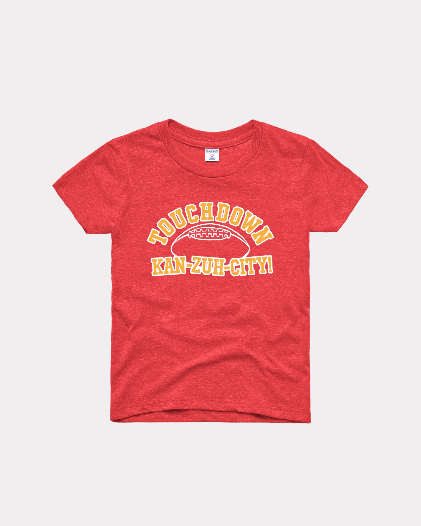 Let the little fans score big style points with the Kids Touchdown Kansas City Red T-Shirt. Featuring bold gold-and-white lettering and a classic football graphic, this tee proudly shouts “TOUCHDOWN KAN-ZUH-CITY!”—the perfect chant for gameday excitement. Made from a super-soft cotton blend, it’s comfy enough for school, playtime, and of course, cheering on Kansas City every Sunday.