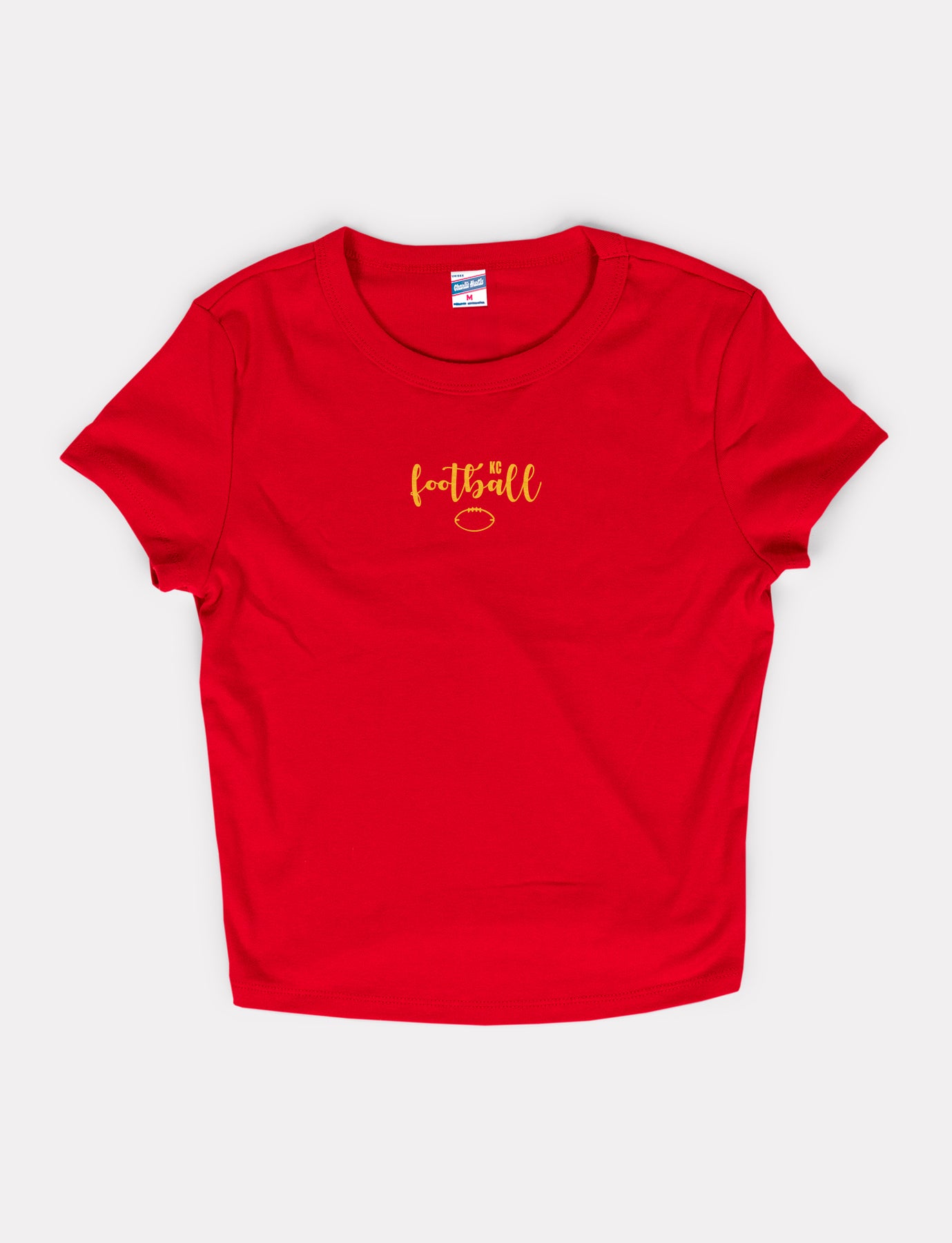 Bring hometown spirit to your wardrobe with the Women’s KC Football Script Red Baby Tee. Featuring gold script lettering with a football graphic, this slim-fit baby tee offers a flattering cut and soft feel. Ideal for tailgates, game days, or casual everyday wear, it’s an easy go-to for showing your city pride.