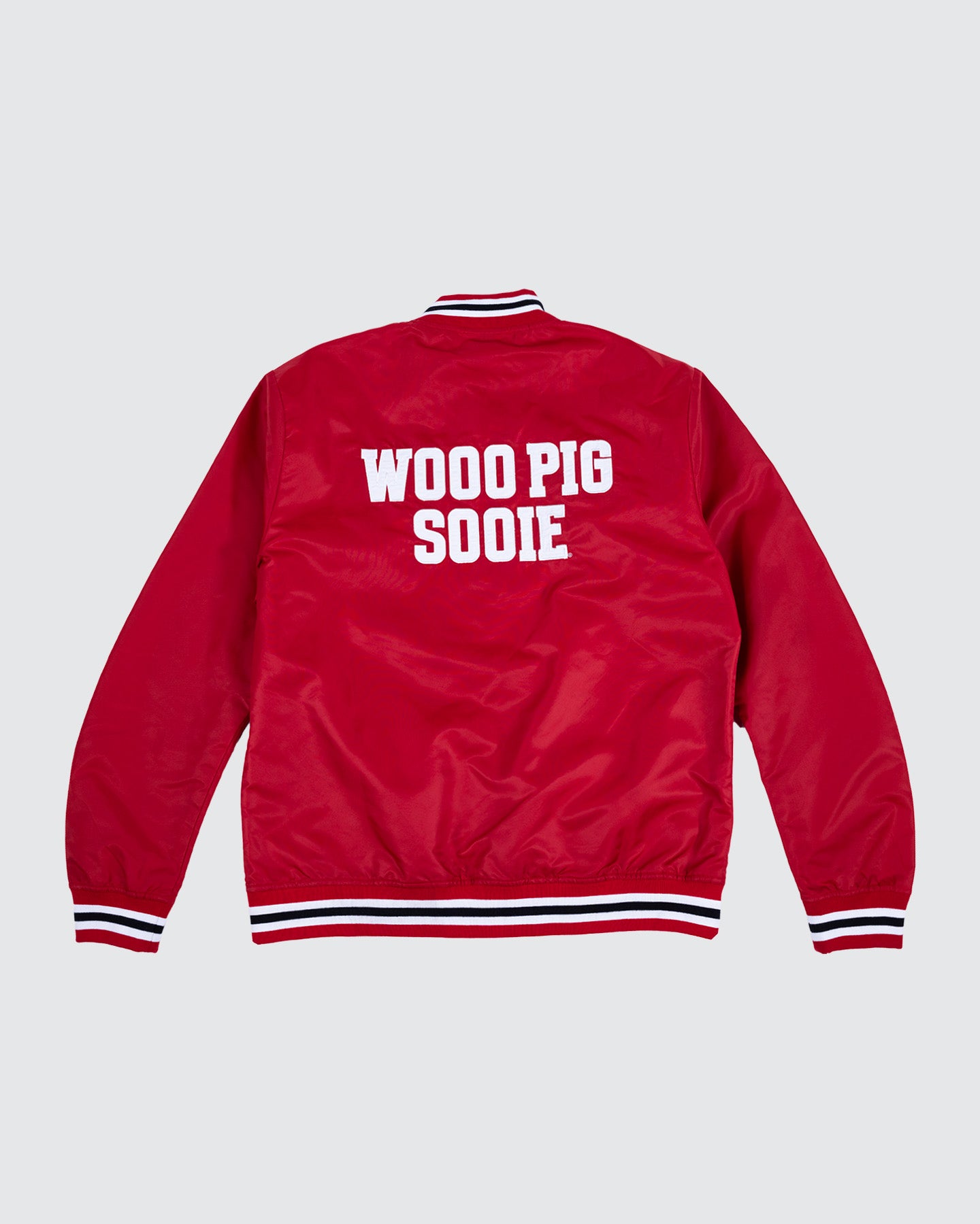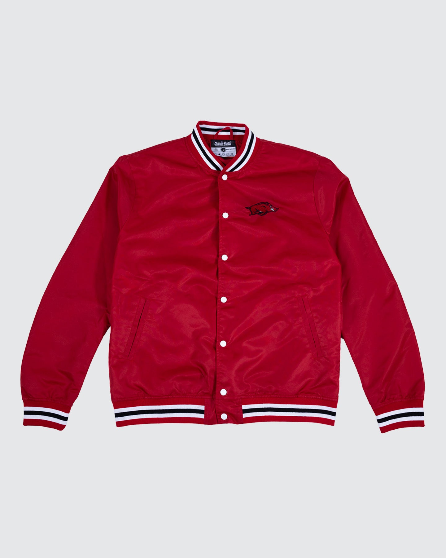 Show your Razorback pride in vintage style with this classic Arkansas Varsity Jacket. Featuring a bold embroidered Razorback logo on the front and the iconic “Wooo Pig Sooie” chant across the back, this jacket perfectly blends school spirit with retro flair. Whether you’re cheering from the stands or strolling through campus, this timeless red-and-white jacket is a true nod to Arkansas tradition.