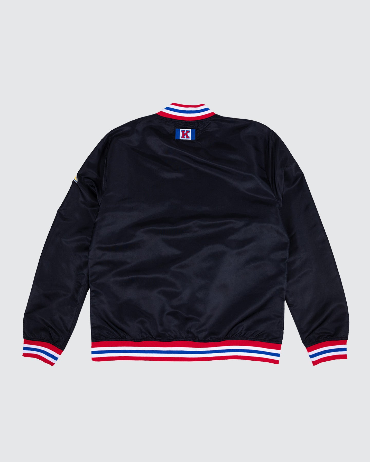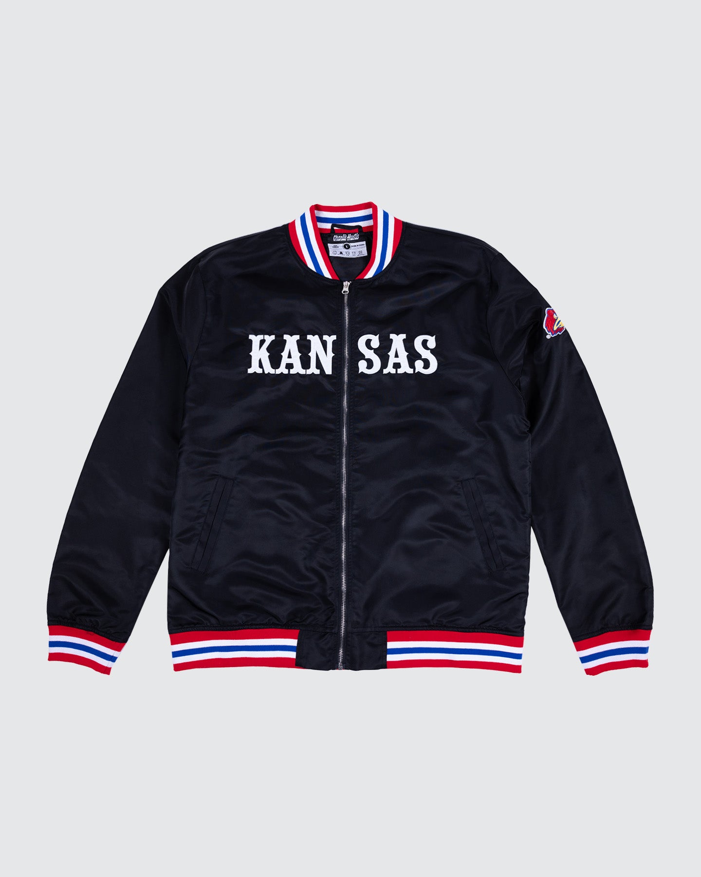 Show off your Jayhawk pride in this vintage-inspired Kansas varsity jacket! With bold “KANSAS” lettering across the chest, classic crimson and blue striped trim, and Jayhawk logos on each sleeve, this jacket delivers timeless collegiate style. Perfect for chilly game days, campus walks, or repping the Rock Chalk spirit wherever you go.