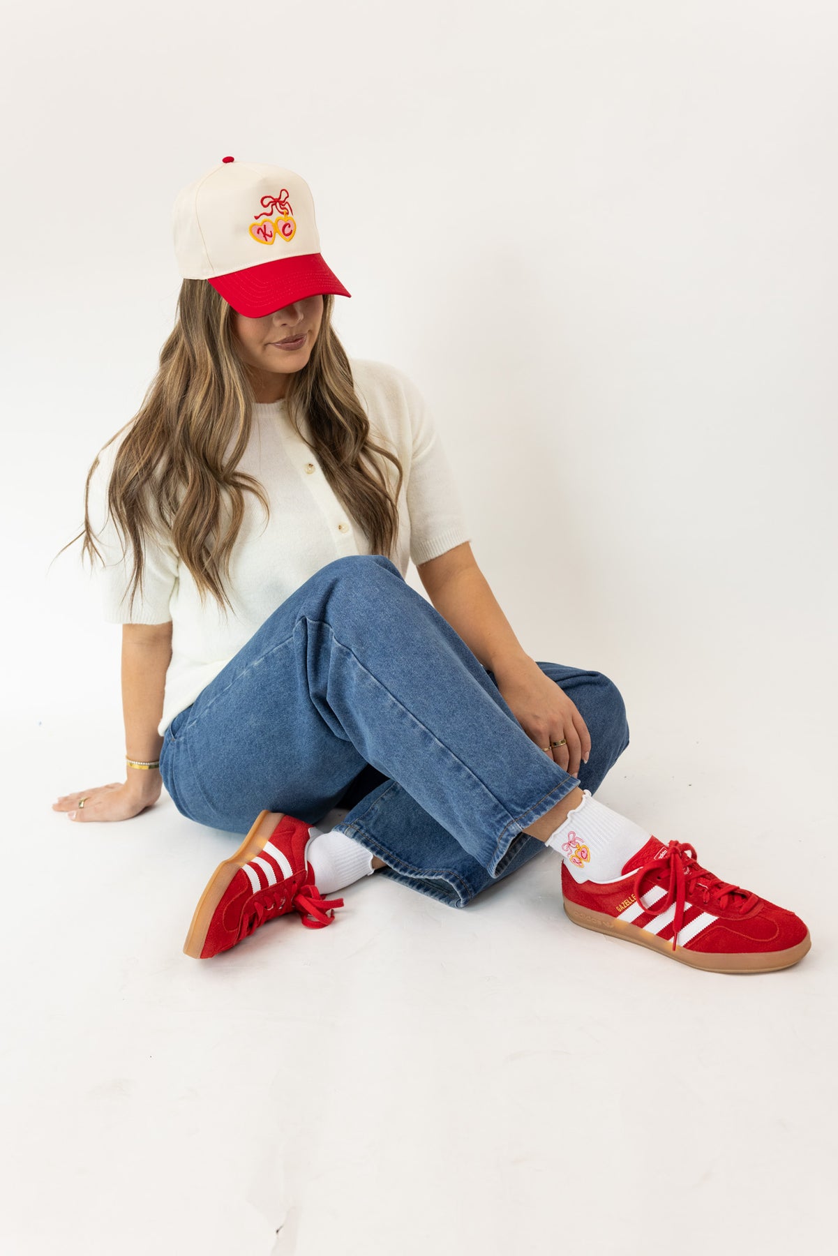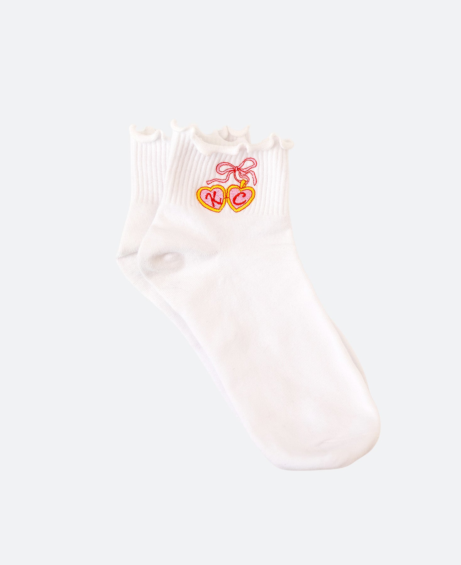 Step out in hometown style with the KC Bow and Lockett Ruffle Socks. These soft white ankle socks feature our KC Heart logo intertwined with a vintage locket. The ruffled edge adds a fun and feminine finish. Whether you’re cheering on your favorite KC team or simply adding a touch of local love to your everyday look, these ruffle socks bring the perfect mix of charm and spirit.