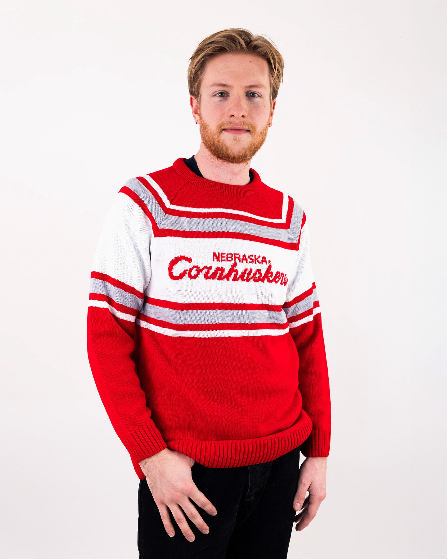 Celebrate Husker tradition with the Nebraska Script Red Sweater. Featuring bold “Nebraska Cornhuskers” script across a classic white chest stripe, this vintage-inspired crewneck embodies timeless collegiate style. The bright red body and clean stripe detailing make it the perfect piece for chilly game days, campus strolls, or showing your Husker pride anywhere you go.