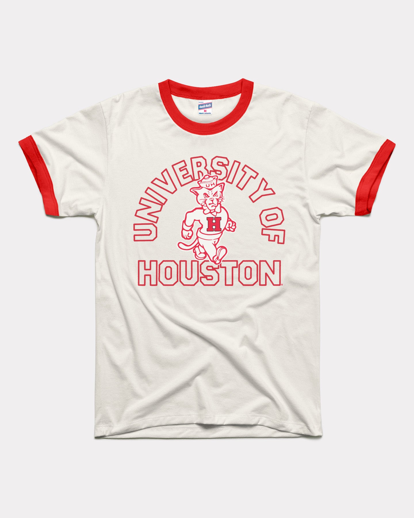 Classic collegiate style meets Houston hoops tradition in this University of Houston Basketball Ringer T-Shirt. Featuring bold arched University of Houston lettering and a vintage Cougar basketball mascot graphic, this design delivers timeless throwback energy for true Coogs fans. The contrasting red ringer collar and sleeve trim add an authentic retro finish that stands out on game day and beyond.