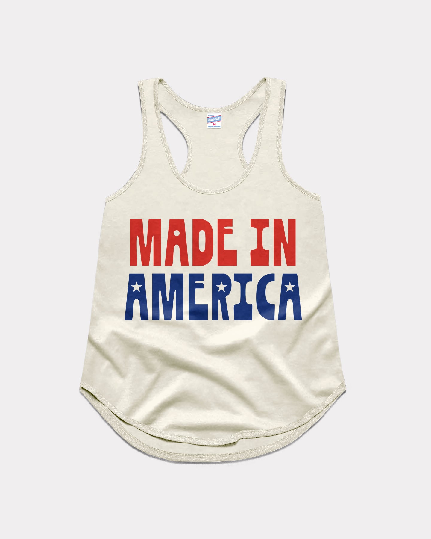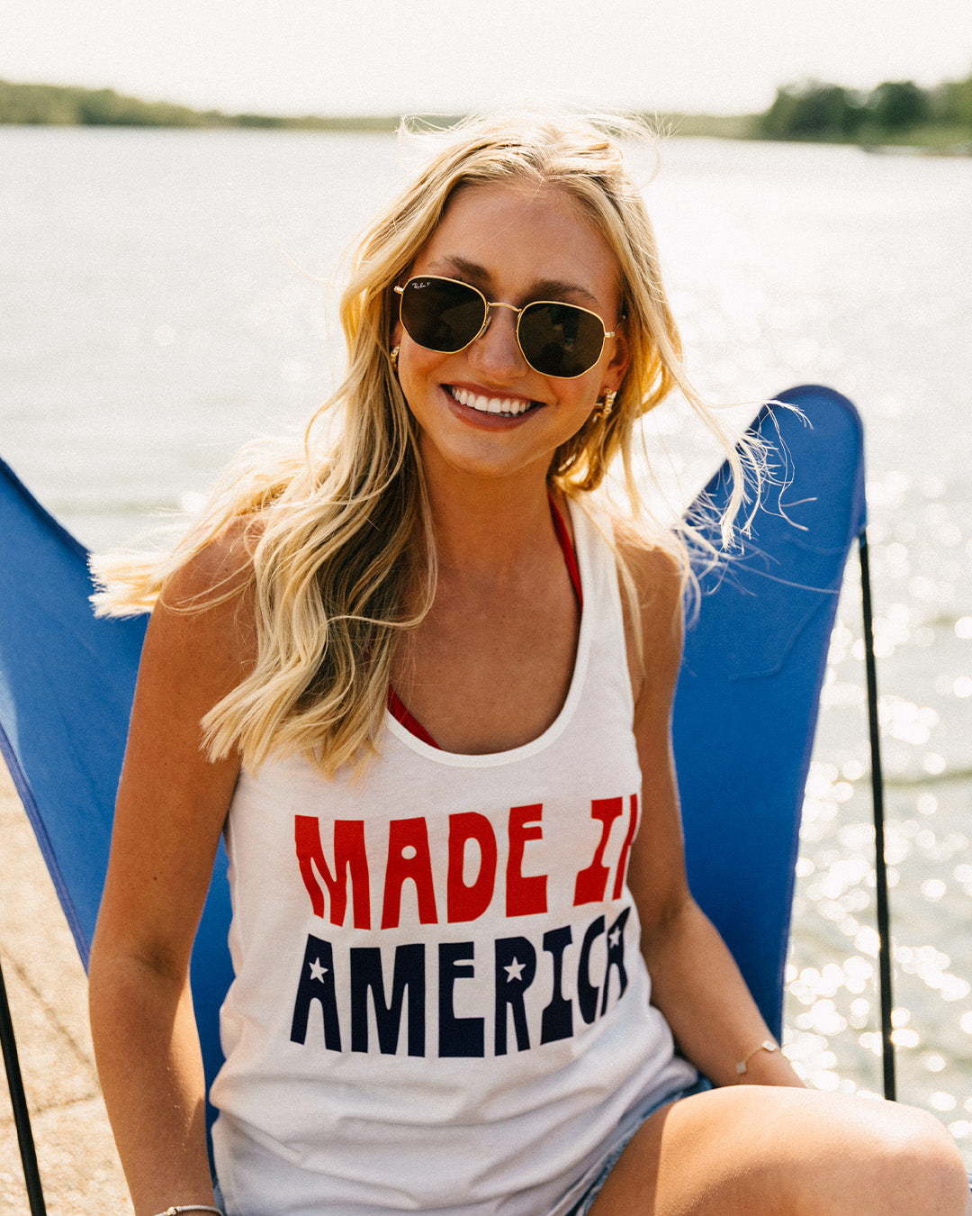 USA all day! This Made in America Racerback Tank Top is lightweight, breathable, and built for sunshine and sparklers. Featuring red, white, and rad lettering with subtle star details, it's the ultimate uniform for 4th of July cookouts, beach days, and backyard games. Freedom never looked so fresh!