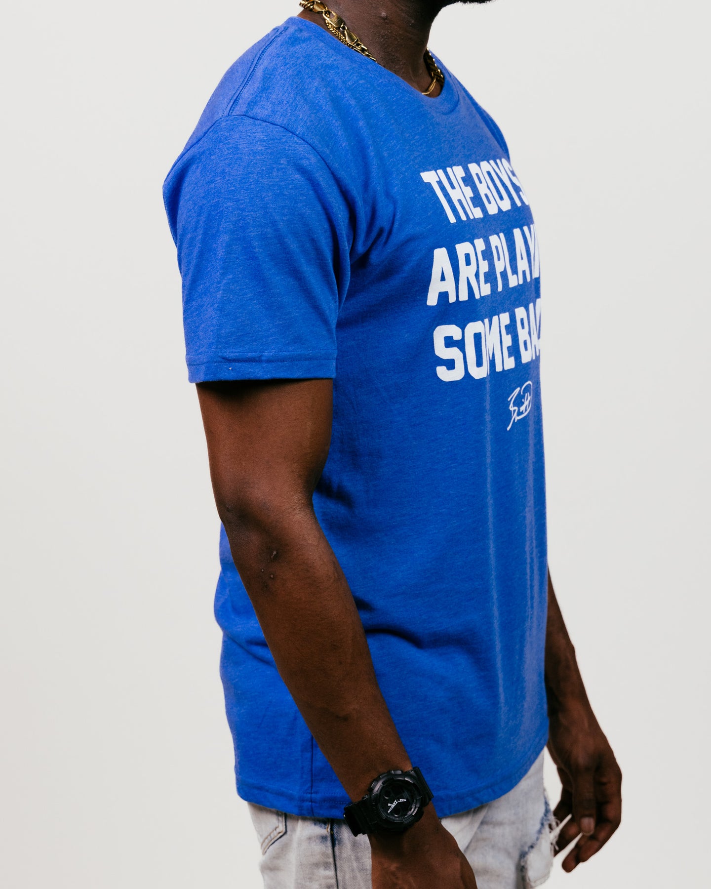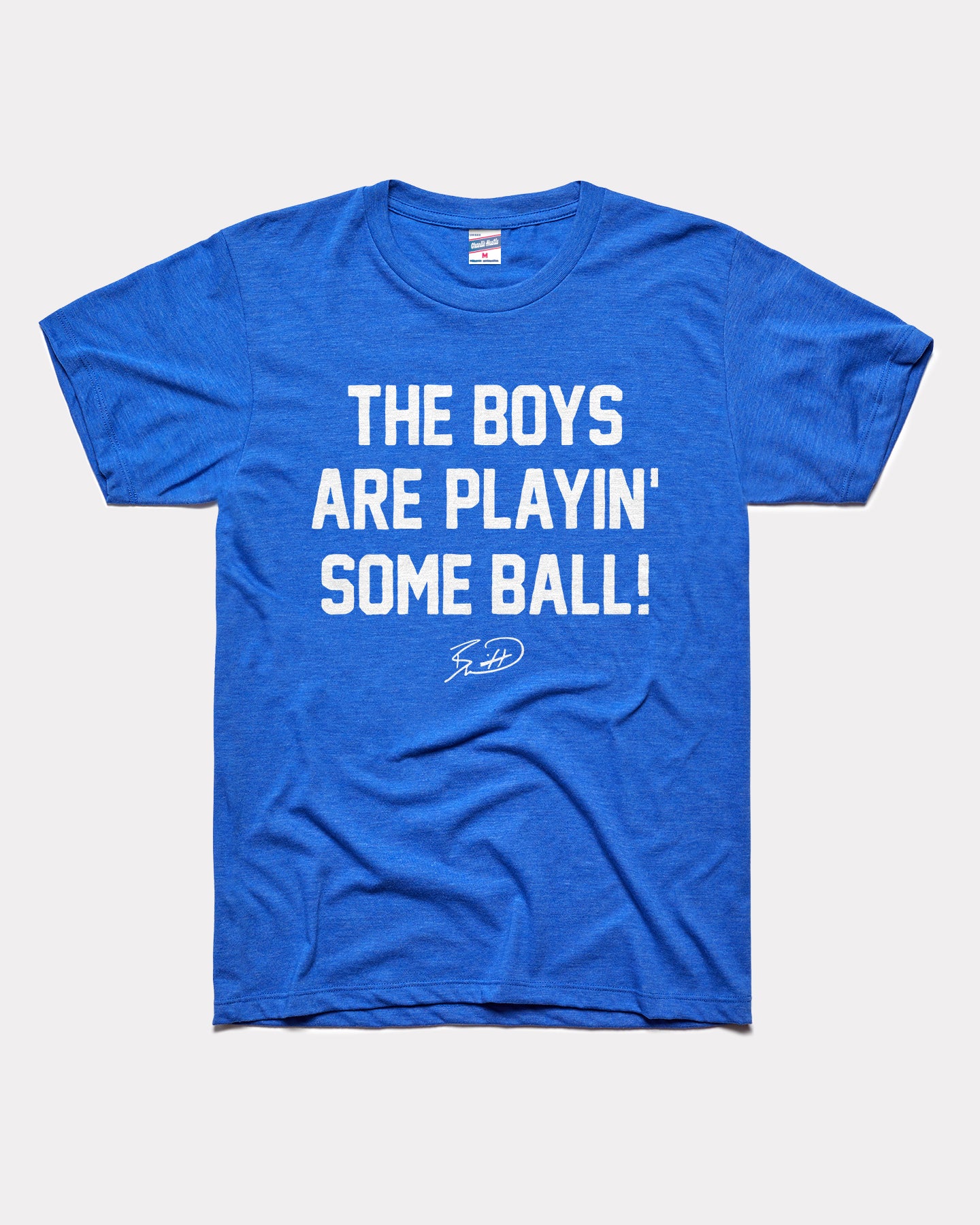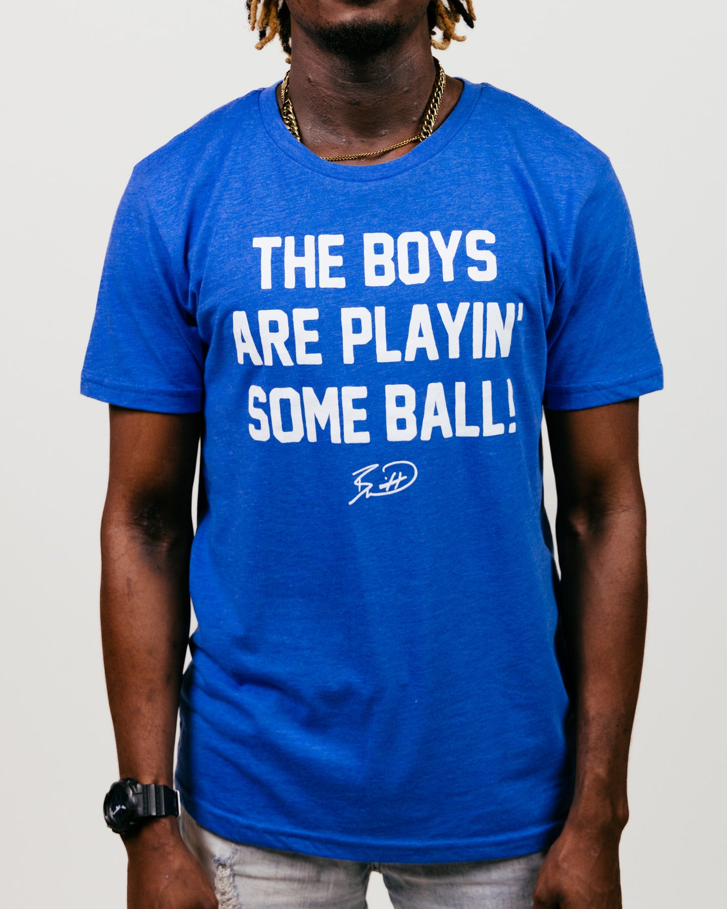 "THE BOYS ARE PLAYIN' SOME BALL!" The boys in blue are makin' noise and playin' some great ball. Paint the town royal blue this season and show your loyalty to royalty with this officially licensed tee featuring the iconic Bobby Witt Jr. quote!