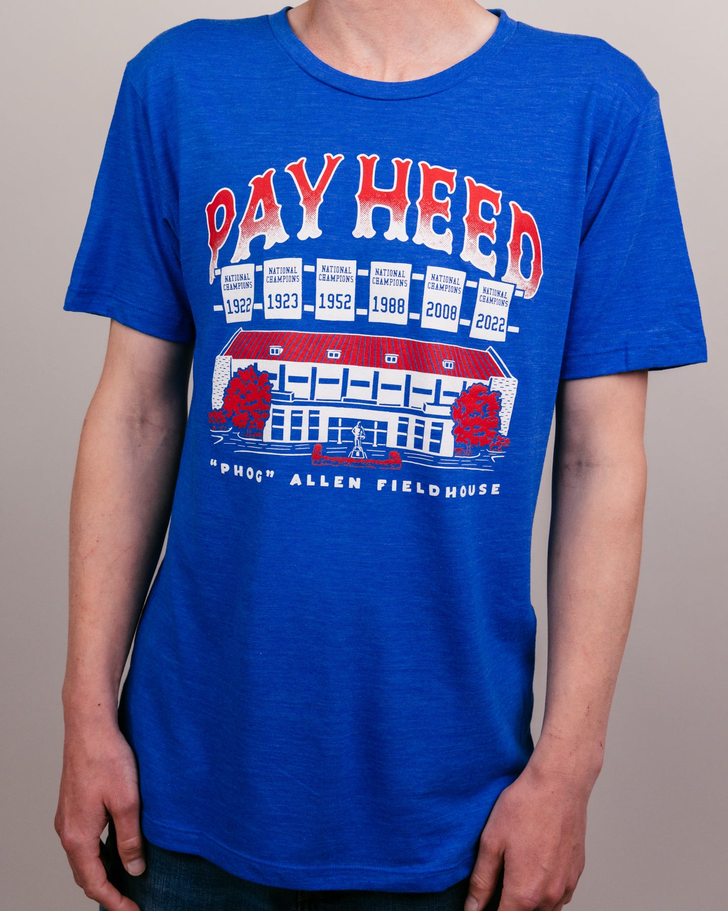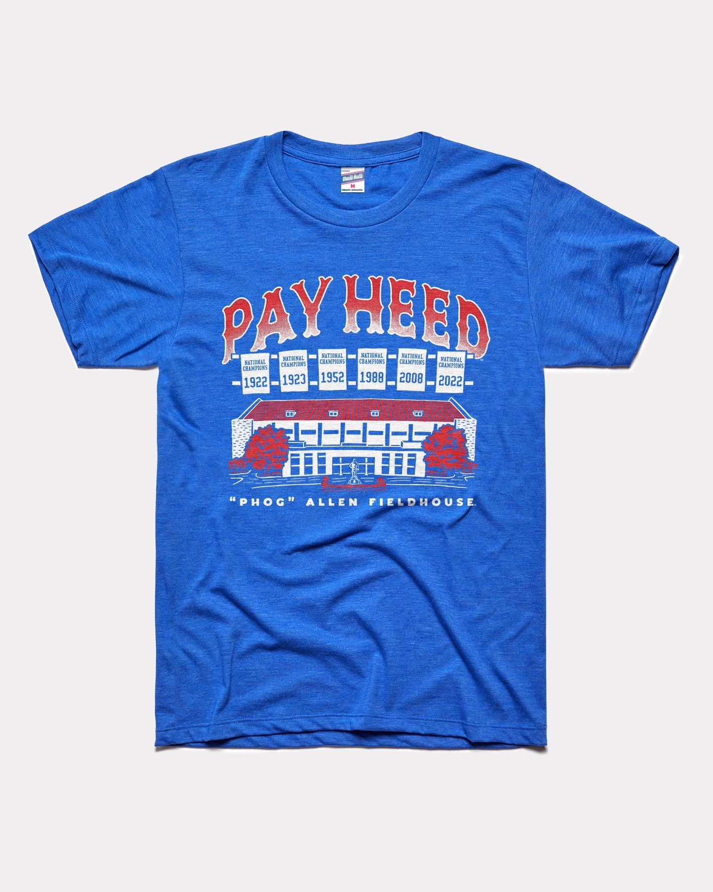 When you walk into Allen Fieldhouse, the first thing you may notice is the infamous banner that reads: Pay Heed, all who enter: Beware of 'The Phog'". The banner references the intimidating atmosphere and the home team's storied dominance in Allen Fieldhouse. Under that, you will see SIX National Champions banners, including the newest one that celebrates the 2022 National Championship team. Pay Heed with this classic KU Basketball tee! Officially licensed College Vault product.