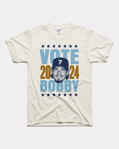 Vote Bobby! Bobby Witt Jr. is one of baseball's most electrifying players and puts on a show every time he steps on the diamond. With his showstopping defense and out-of-this-world batting power, Bobby Baseball is must-see TV. Cast your vote and show your support for Bobby with this officially licensed Vote Bobby Witt T-Shirt!