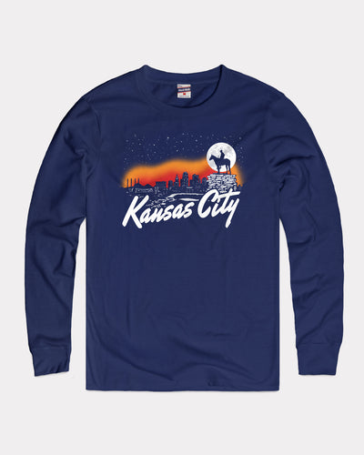 Dedicated in 1922 as a memorial to local Indian tribes, "The Scout" statue, which sits just south of downtown Kansas City in Penn Valley Park, depicts a Sioux scout on horseback looking over the city. This supremely soft Kansas City Nightlife Long Sleeve pays tribute to the Scout statue and the beautiful city we call home!