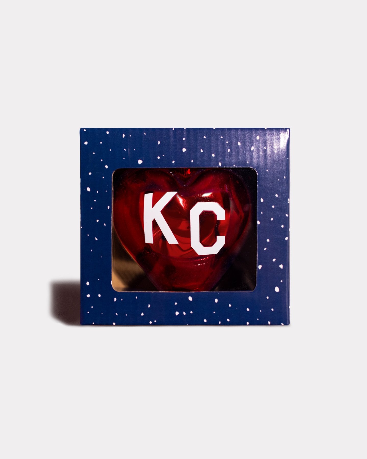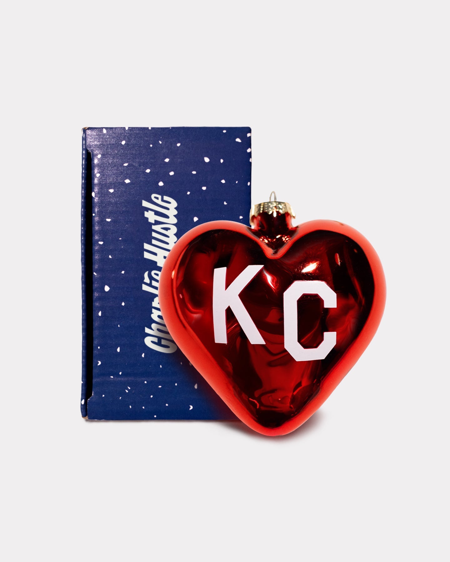 Decorate your tree with a little hometown flair this year with this KC Heart Glass Ornament. Made of 100mm glass, this limited edition ornament will shine bright on any holiday tree and makes for the perfect gift to anyone who has a special connection to the city we call home! Comes in a Charlie Hustle branded box.